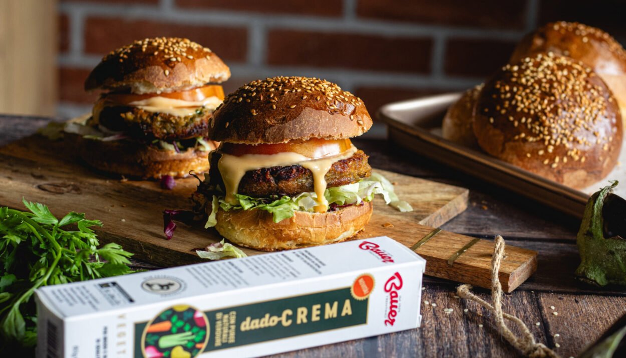 Taglia la melanzana a tocchetti e cuoci in padella con olio, sale, pepe e Dadocrema Vegetale Bauer per 10-15 minuti. Schiaccia, aggiungi pangrattato, parmigiano e prezzemolo. Forma i burger con un coppapasta da 8 cm. Cuoci in padella con olio caldo per 10 minuti, girandoli con delicatezza.